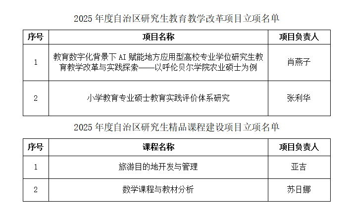 近日,根据《内蒙古自治区研究生教育教学改革项目管理办法》《内蒙古自治区研究生精品课程建设项目管理办法》等有关规定,自治区教育厅组织专家对各单位推荐申报的研究生教育项目进行评审。经严格评审,我校肖燕子、张利华两名教师获批自治区研究生教育教学改革项目;亚吉、苏日娜两名教师获批自治区研究生精品课程建设项目。