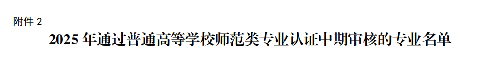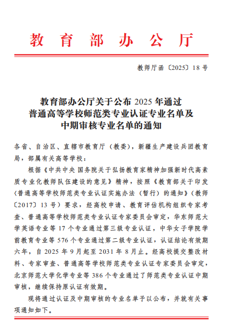 近日,教育部办公厅正式发布了《教育部办公厅关于公布2025年通过普通高等学校师范类专业认证专业名单及中期审核专业名单的通知》(教师厅函[2025]18号)。在此次认证中,我校美术学、思想政治教育、英语、体育教育专业成功通过第二级专业认证。数学与应用数学专业通过师范类专业认证第二级认证中期审核。